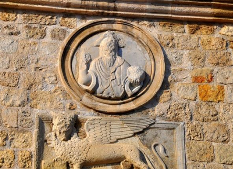Πάνω από το κεντρικό τμήμα της πρόσοψης υπάρχει θριγκός. Ένα ιδιαίτερα ψηλό στηθαίο από αρχικά, επιχρισμένη λιθοδομή ολοκλήρωνε την σύνθεση. Στο στηθαίο πάνω από τη μνημειακή πρόσοψη υπάρχει εντοιχισμένη ορθογώνια ανάγλυφη πλάκα με φτερωτό λέοντα που βαδίζει προς τα αριστερά και κρατά ανάμεσα στα μπροστινά πόδια του ανοιχτό ευαγγέλιο. Πάνω από αυτήν έχει εντοιχιστεί ανάγλυφο μετάλλιο με τη μορφή του Παντοκράτορα, που ευλογεί με το δεξί και στο αριστερό κρατά σφαίρα. Περιβάλλεται από την επιγραφή OMNIPOTENS.